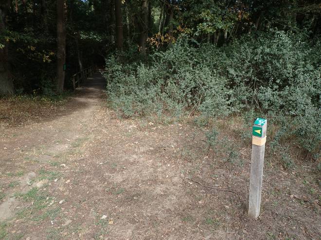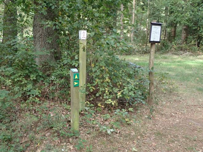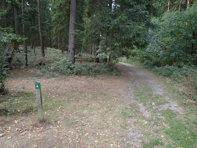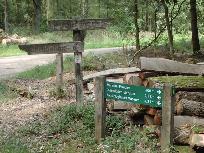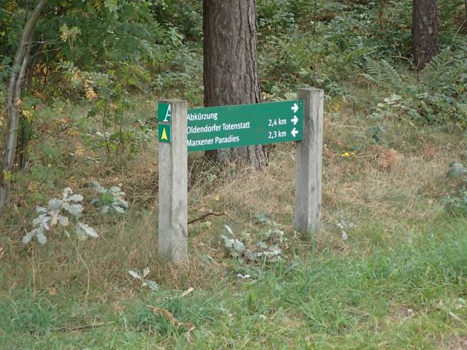 Parkplatz Kronsbergheide 14.12 Uhr / Km 34,4 Auf ging es in die letzten 11,2 Kilometer. Einmal den grünen Pfeilen über den Sagenhaften Hünen-Weg folgen. |