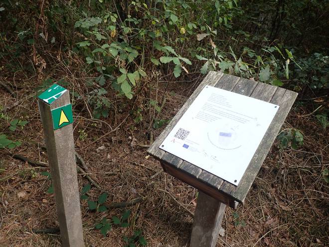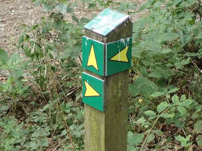 14.33 Uhr / Km 37,6 Dieser Pfeil-Chaos sollte mir sagen, daß die Stempelstelle abseits vom Weg lag. Seltsam. An der Schwindequelle war das anders gelöst. Letztendlich lief man hier und da vorbei, wenn man es nicht explizit vorher gewußt hat. |