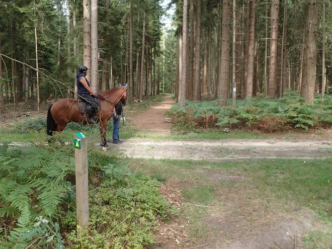 14.25 Uhr / Km 36,3 Vorsicht Pferd. Dieses Mal zwar mit Reiterin, aber auch ohne Zaun. |