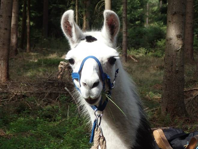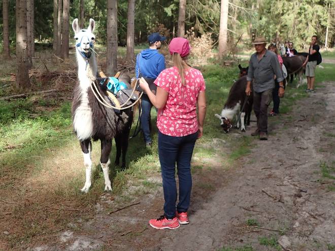 14.29 Uhr / Km 37,0 Lama??? Okay... ich hatte am Platzplatz Kronsbergheide den Transporter gesehen, wo etwas mit Lama drauf stand, aber ich hätte doch nie im Leben mit echten Tieren gerechnet. |