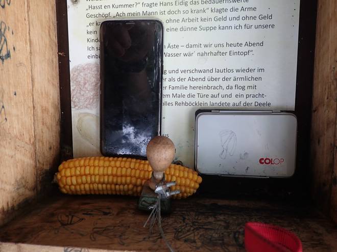 Hans Eidig 14.48 Uhr / Km 39,3 Das Handy gehörte mit, der Stempel gehörte hierher, aber der Maiskolben? Naja... ich hatte ihn mir früher im Rennen ja tatsächlich mal gewünscht. Wo war die Mikrowelle?? :-) Ja, ich hätte mir auch Strom wünschen müssen... |