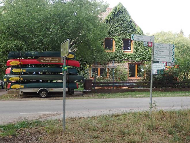 Amelinghausener Straße (K 234) Oldendorf 15.07 Uhr / Km 41,9 Ein Museum, ein Kanu-Verleih und ein Restaurant hatte ich in Oldendorf gefunden. Keinen Supermarkt oder ähnliches mit Lebensmitteln. |