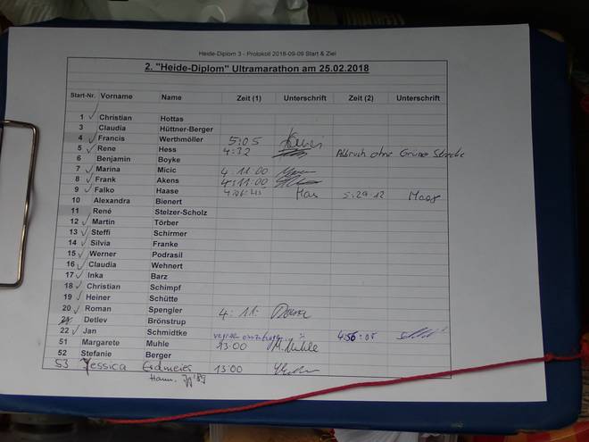 Parkplatz Kronsbergheide 15.35 Uhr Oh ha. Jan war 33 Minuten vor mir im Ziel gewesen und schon längst auf dem Heimweg. Er hatte nur vergessen, sich beim ersten Durchlauf hier in die Liste einzutragen. Rene hatte das Rennen beim ersten Durchlauf abgebrochen. Marina und Frank kamen 6:23 Minuten nach mir ins Ziel. |