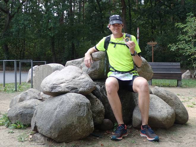Parkplatz Kronsbergheide 15.33 Uhr 5:29:12 Stunden. Wobei die Auswertung meiner Uhr ergab, daß ich nur 5:10:58 Stunden tatsächlich unterwegs war. Den Rest der Zeit verbrachte ich stillstehend an Stempelstellen und Verpflegungspunkten. Zudem war die Gesamtstrecke mit 46,65 Kilometern länger als die offizielle Strecke. So war mein reelles Lauftempo genau 6:40 Min/km. 9 Km/h. Das war gut. |