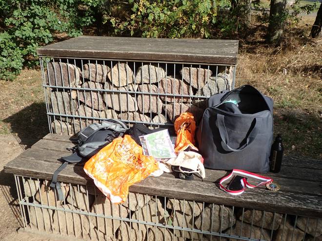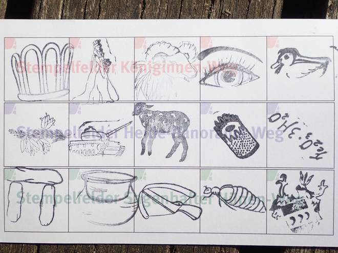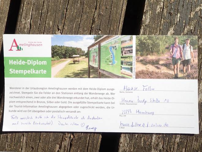 Parkplatz Kronsbergheide 16.10 Uhr Als Briefkasten diente uns Christians Auto. Er würde alle Stempelkarte gesammelt an die Tourist-Info Amelinghausen schicken, dann die Heide-Diplome mit der Unterschrift von Heide-Königin Mona bekommen und diese an uns Finisher weiter senden. |