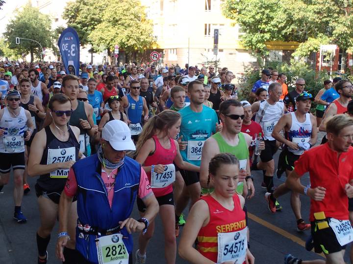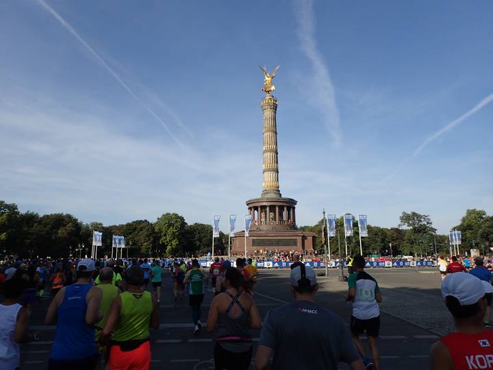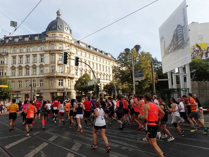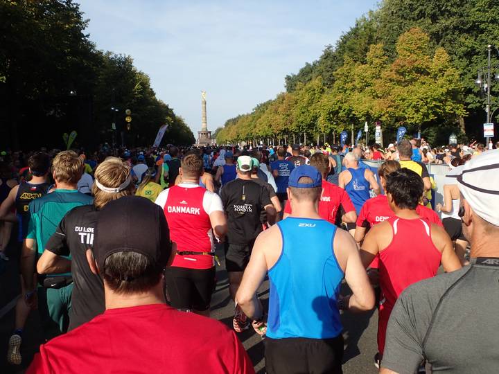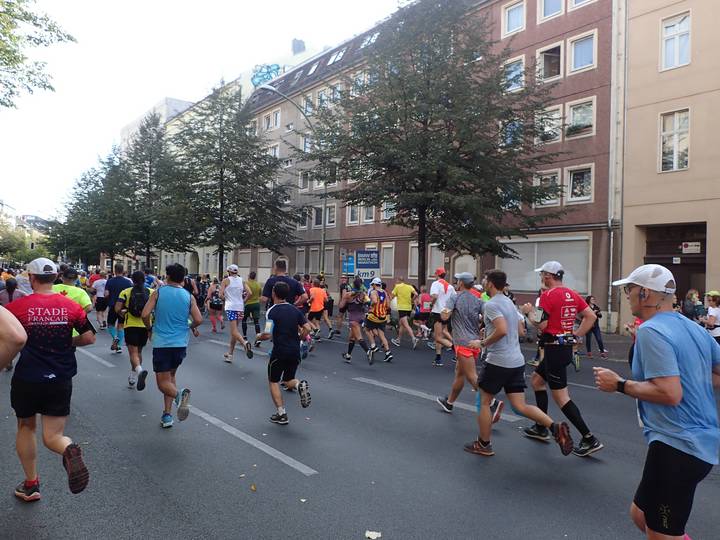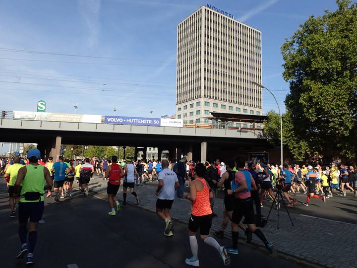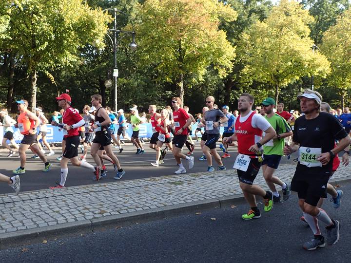 Straße des 17. Juni (B 2) 9.36 Uhr / Km 1,6 Wie geplant lief ich auf 5:40 Min/Km an. Das fühlte sich aber verdammt schnell und anstrengend an. Und das wollte ich 42,195 Kilometer lang durchalten? |