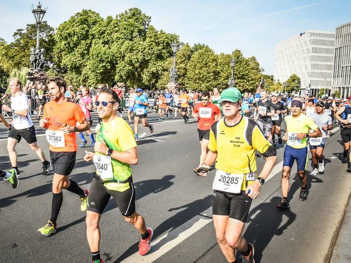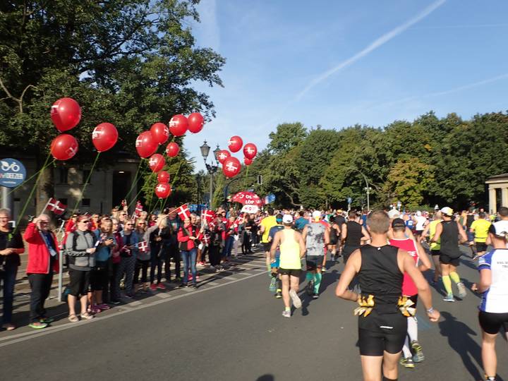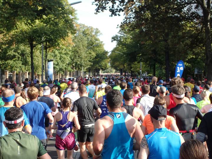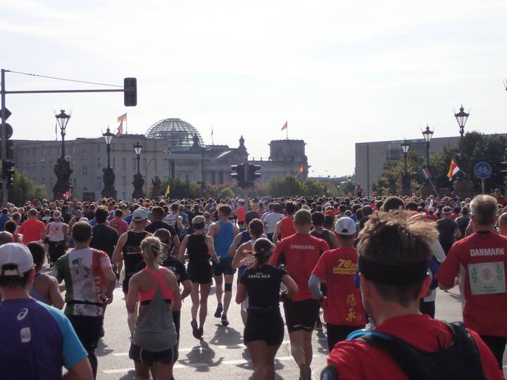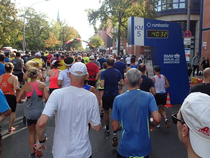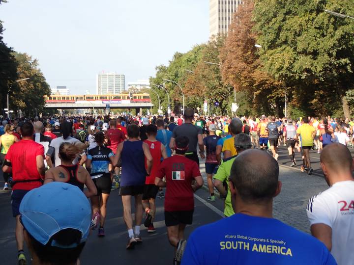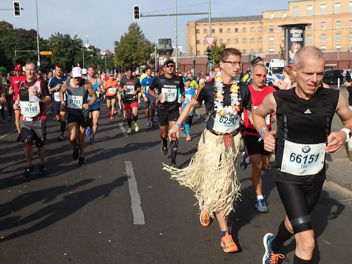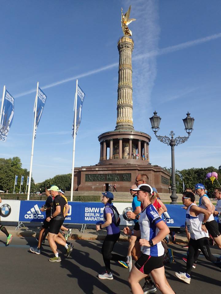 Straße des 17. Juni (B 2) 9.36 Uhr / Km 1,6 Wie geplant lief ich auf 5:40 Min/Km an. Das fühlte sich aber verdammt schnell und anstrengend an. Und das wollte ich 42,195 Kilometer lang durchalten? |