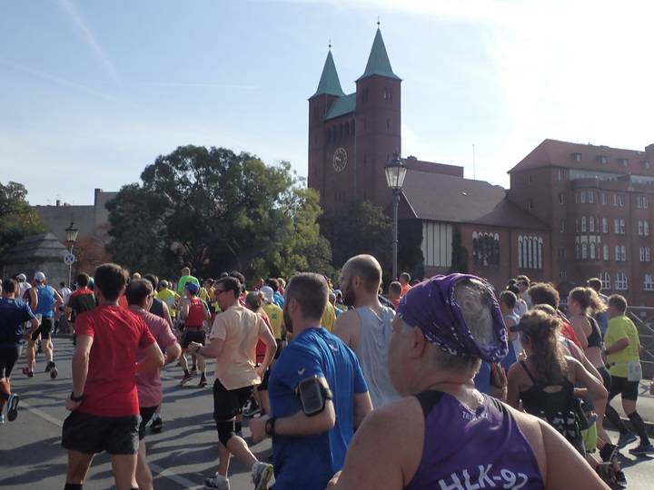 Gotzkowskybrücke 9.48 Uhr / Km 3,7 Es ging über die Spree und an der Erlöserkirche vorbei. |