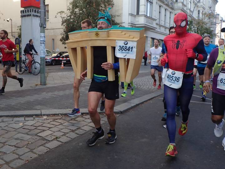 Alt-Moabit 9.55 Uhr / Km 4,9 Da waren Spider-Man und das Brandenburger Tor wieder. Diese Zwei hatte ich ja schon vor dem Start getroffen. |