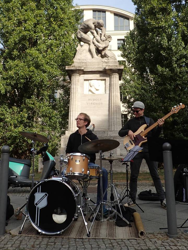 Reinhardtstraße Karlplatz 10.08 Uhr / Km 7,4 Eine der vielen Bands entlang der Strecke. Hier direkt vor dem Virchow-Denkmal. |