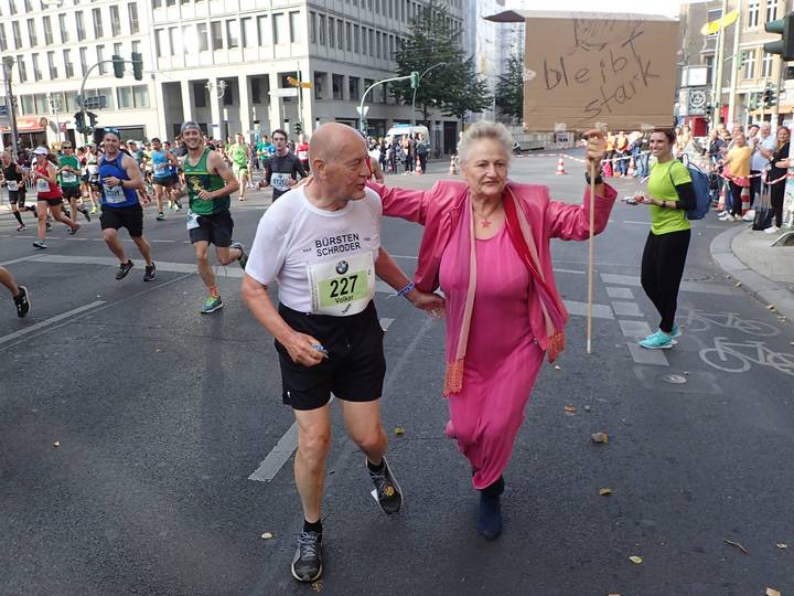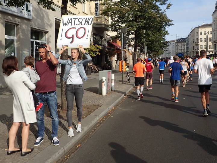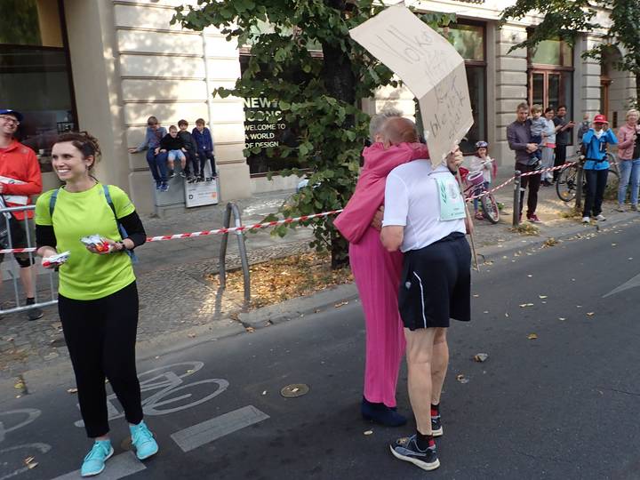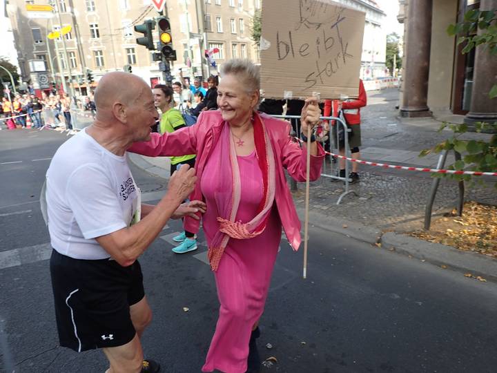 Torstraße 10.13 Uhr / Km 8,4 "Volker bleib stark" stand auf dem Schild. Volker, Jahrgang 1942 lief schon zum 36. Male beim Berlin-Marathon mit. |