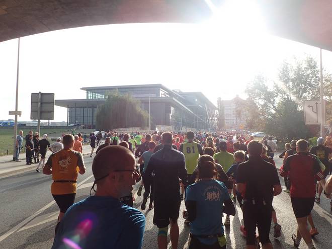 Ostra-Ufer 10.35 Uhr / Km 0,5 Dann aber liefen wir rechts statt links am Internationalen Congress Center vorbei. |
