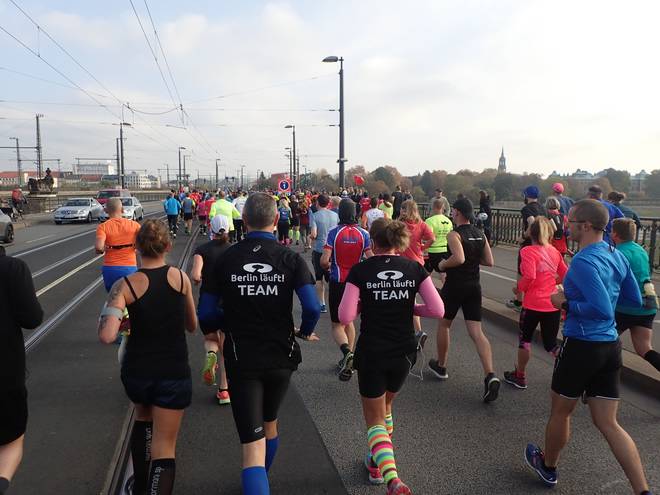 Devrientstraße 10.37 Uhr / Km 0,7 Auf der Rampe hinauf zur Marienbrücke kamen die ersten Höhenmeter. |