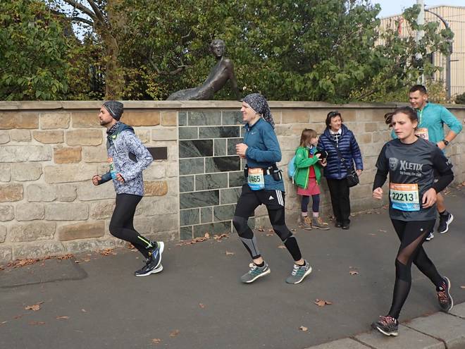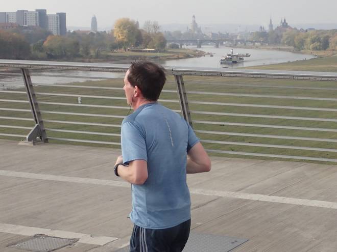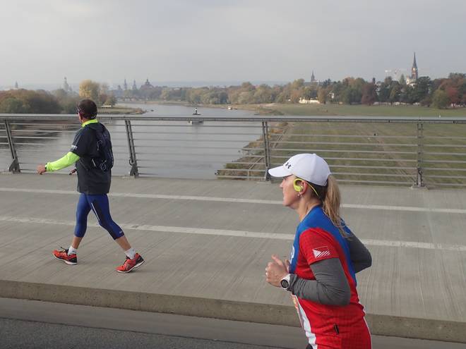 Devrientstraße 10.37 Uhr / Km 0,7 Blick hinunter auf das Ostra-Ufer mit der Marienbrücke im Hintergrund. All die Läufer waren schon einmal hinter mir. Zumindest die unten... die oben auf der Brücken waren vor mir. |