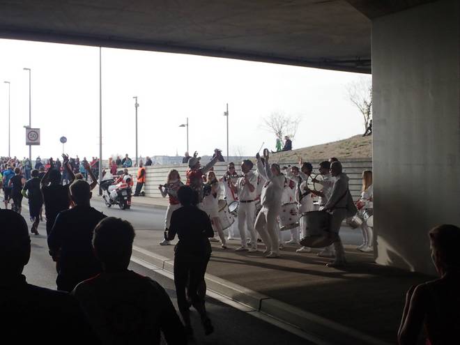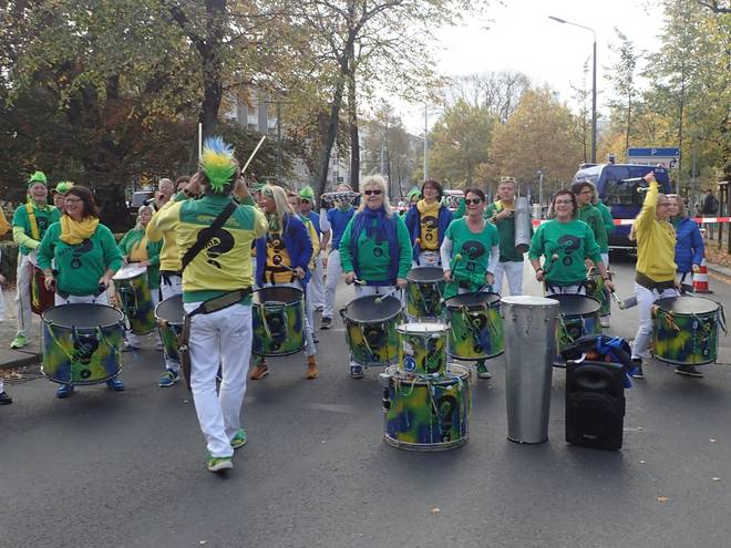Albertplatz 10.47 Uhr / Km 2,5 Die Samba-Trommler, die am Samstag vor der Marathon-Messe trommelten, fand man auch entlang der Strecke. |