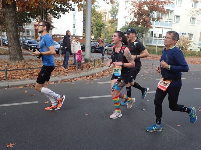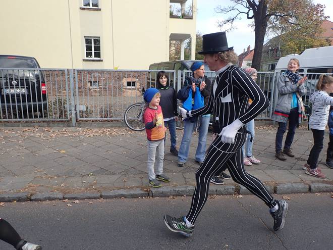 Fetscherstraße 11.30 Uhr / Km 9,7 Das hier war ebenfalls kein Kostüm, aber schön bunt. |