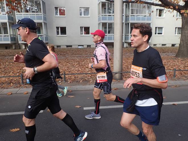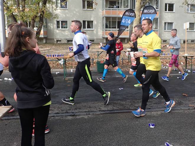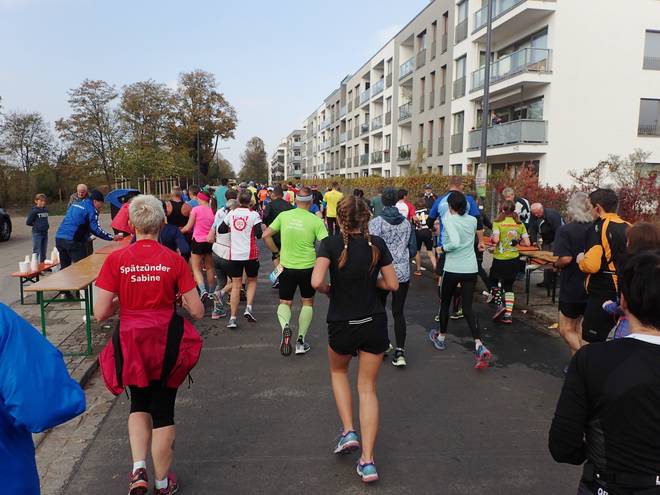 Fetscherstraße 11.31 Uhr / Km 9,9 Am zweiten Verpflegungsstand traf ich erstmals auf die 4:14-Stunden-Zeitläufer, die mich überholten. Wenn die auf eine Brutto-Zeit liefen, wären das für mich 4:12 Stunden netto. Würde bei einer Wunschzeit von 4:13 Stunden ja passen. Kurz danach hängte ich sie wieder ab. |