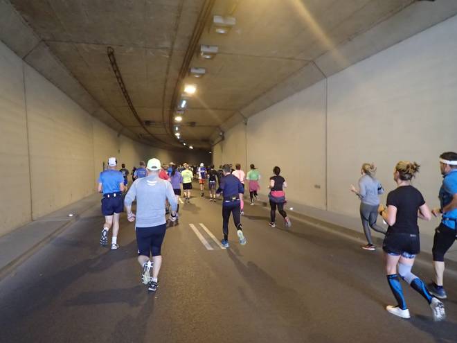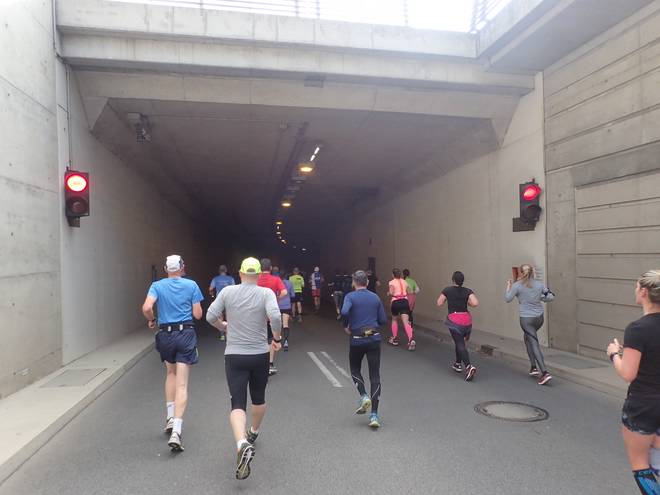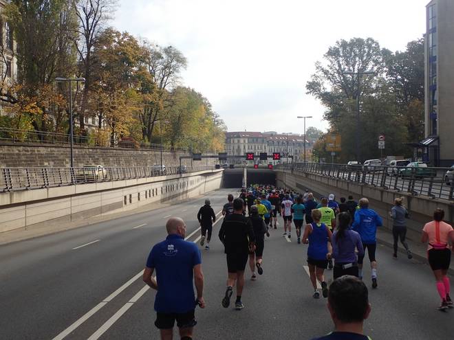 Waldschlößchentunnel 11.16 Uhr / Km 7,3 Läufer haben gewisse Reflexe. Einer davon ist es, in Tunneln laut herum zu schreien. Ganz schöner Krach. Aber da war noch etwas anderes. |