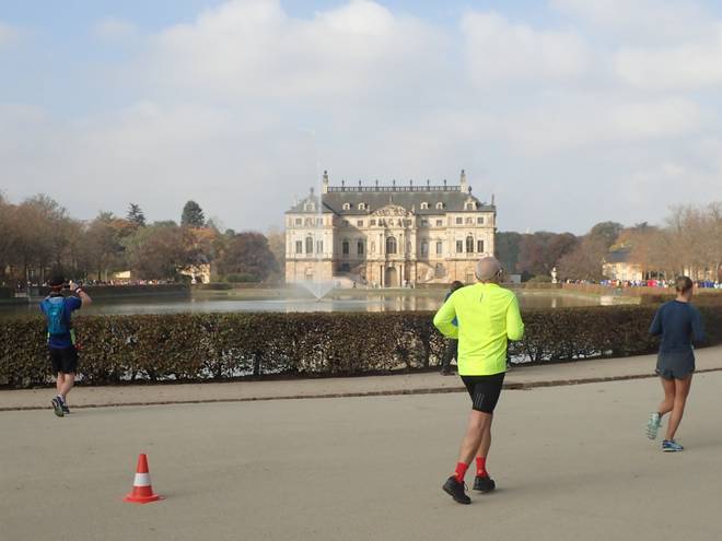 Hauptallee 11.58 Uhr / Km 14,4 Da hatte ich hier am Palais Großer Garten und dem Palaisteich ja richtig Glück mit dem Wetter. |