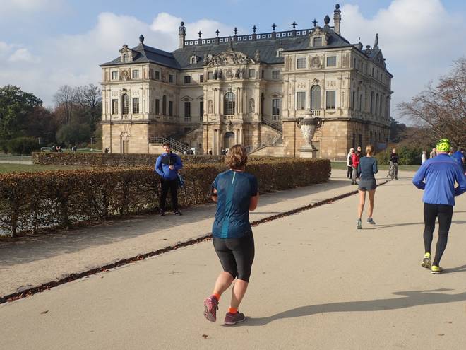 Stübelallee 11.37 Uhr / Km 10,9 Nun ging es an den Großen Garten. Meist drum herum, aber auch ein Stück mitten hindurch. Aber das dauerte noch. |