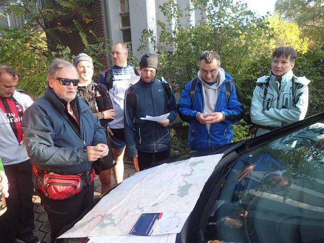 Bei der Lutherbuche 10.16 Uhr / 0,05 Km Die Gepäckfrage klärte sich in letzter Sekunde. Ich ließ das Gepäck nicht in einem Auto. Ralf bot seinen Kofferraum an (vielen Dank dafür) und lief ungefähr so schnell wie ich, aber auf 47 Kilometern kann viel passieren. Jedem von uns. |