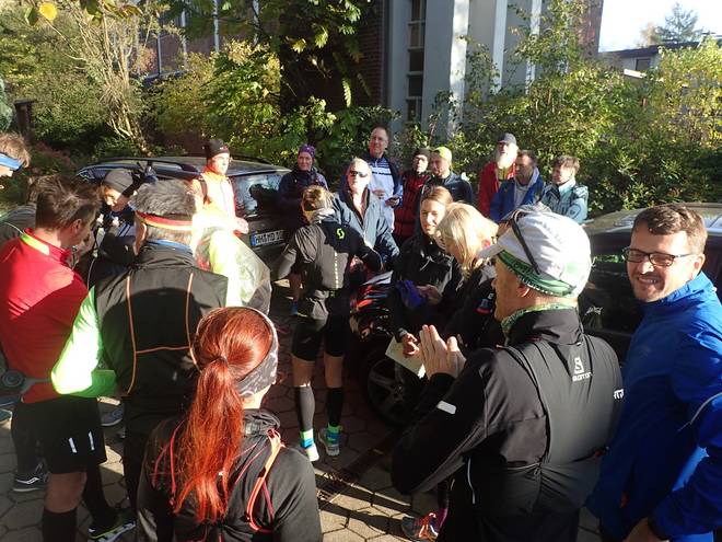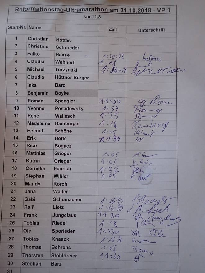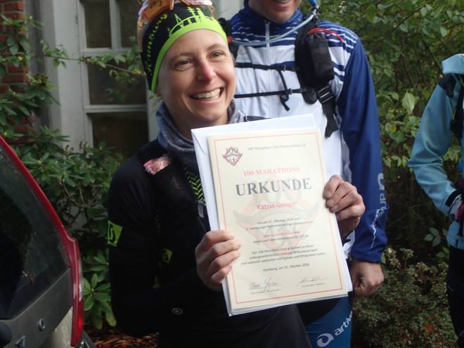 Bei der Lutherbuche 10.11 Uhr Katrin Grieger lief an diesem Tag ihren 100. Marathon oder Ultramarathon. Da sie mit hoher Wahrscheinlichkeit mit Matthias vor allen anderen im Ziel sein würde, gab es die Urkunde schon vorab. |