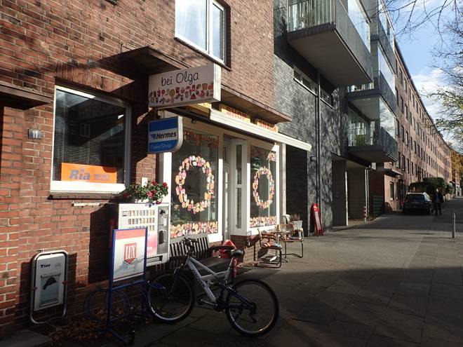 Braamkamp 10.51 Uhr Nach Hause ging es fast nur bergauf. Aber auf halben Weg konnte ich bei Olga schnell Zeitungen und Brötchen holen. |