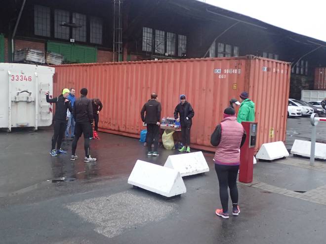 Runde 18 13.13 Uhr / Km 29,4 Werner, Jens-Peter und Inka vor Schuppen 51. Wieder rannte ich über den Parkplatz. |