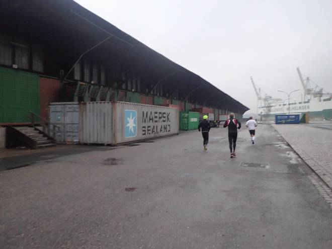 Runde 3 10.30 Uhr / Km 4,4 Stattdessen lief ich nahe der Kaimauer zum Hansahafen durch die Kräne durch. |