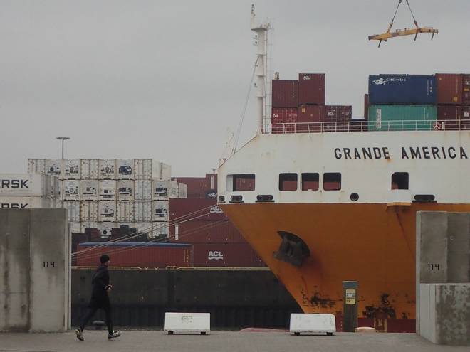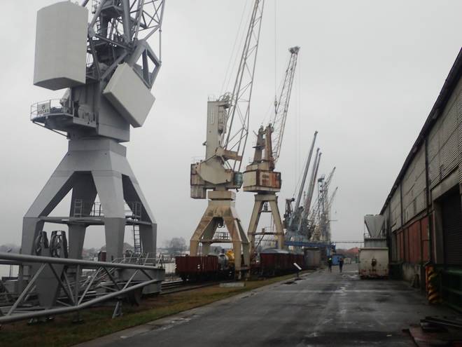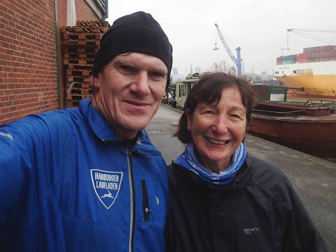 Runde 6 11.01 Uhr / Km 9,1 Michele und Jens-Peter vor den Kränen im Hansahafen. |