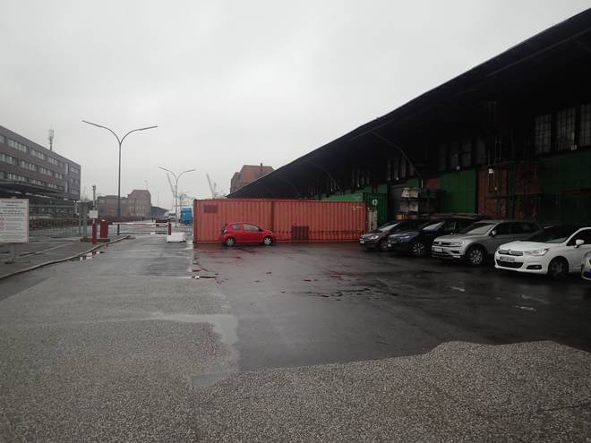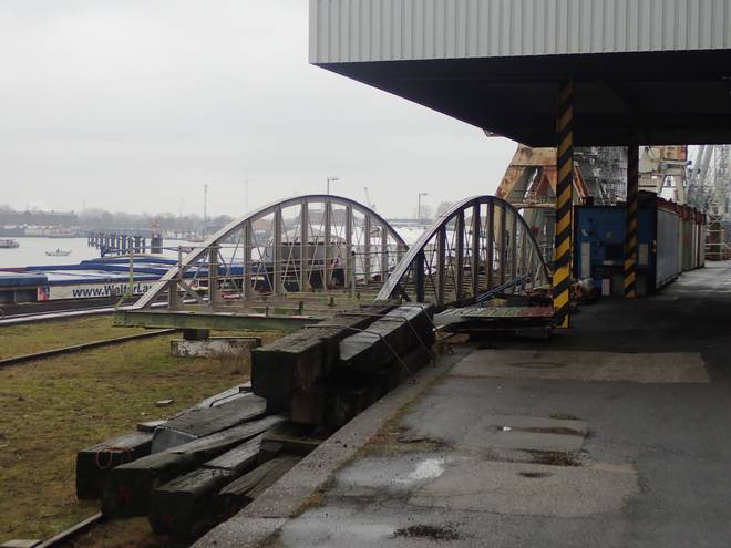 Veddeler Damm 9.27 Uhr Schon auf dem Weg zum Start gab es Hafen-Historie pur zu bewundern. |
