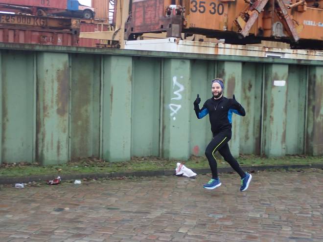 Runde 6 11.04 Uhr / Km 9,7 Oliver vor dem Gang zwischen den Schuppen 50 und 51. |