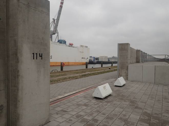 Runde 24 14.21 Uhr / Km 40,1 Zum vorletzten Mal ging es durch den Durchgang Loch in der Flutschutzmauer rüber in den Hansahafen. |