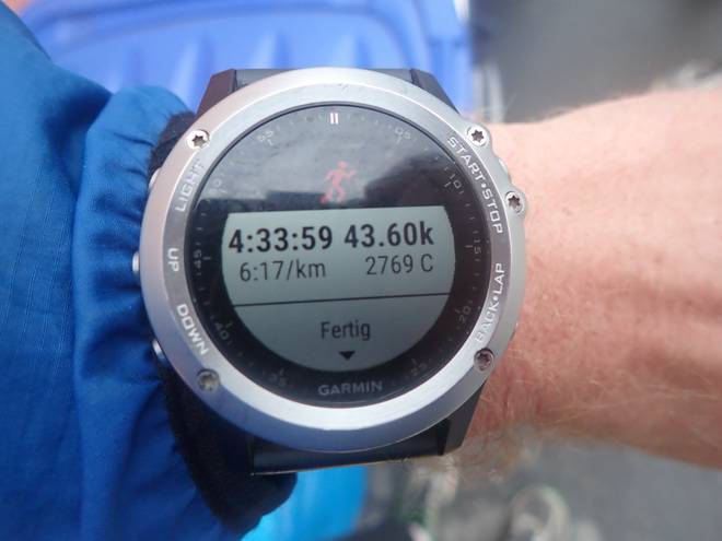 Finish 14.38 Uhr / Km 42,725 4:33:59 Stunden. Gerade noch unter 4:34 Stunden gelaufen. War jetzt nicht soooo wichtig, aber... naja... :-) |