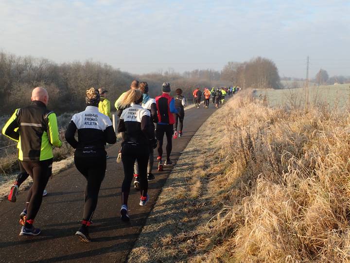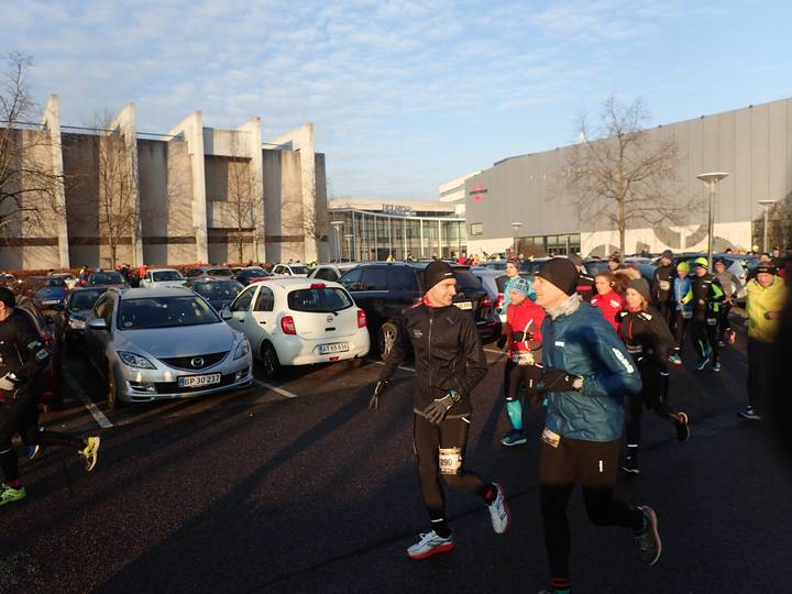 Willy Sørensens Plads Vejle Center 10.01 Uhr / Km 0,2 Der erste Rekord war sicher. Mit -3°C am Start war es mein bis dahin kältester Marathon. Wobei es so schlimm gar nicht war. Es war sonnig, der Wind war kaum spürbar. Etliche meiner früheren Marathons waren gefühlt kälter. Foto: Hans Beck Møller |