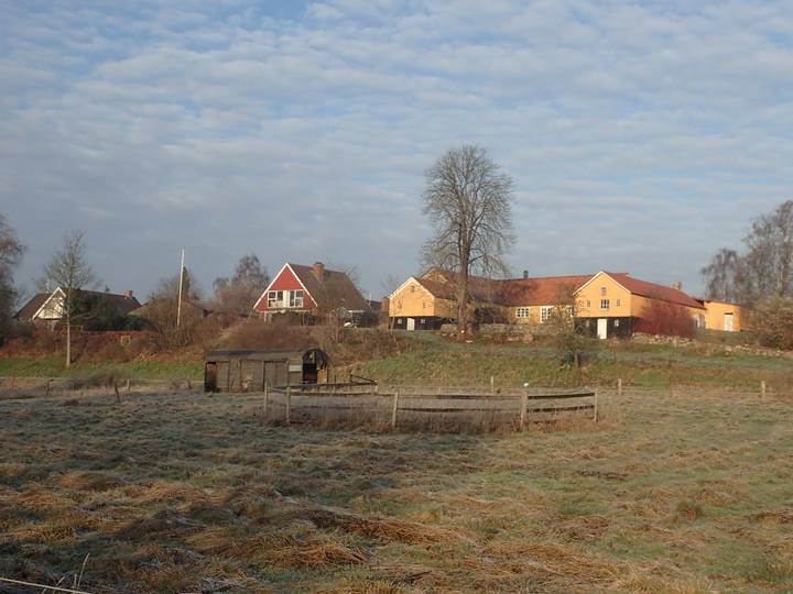 Østengård 10.34 Uhr / Km 5,6 Häuser von Østengård, das wir südlich passierten. |