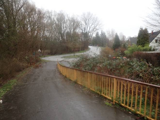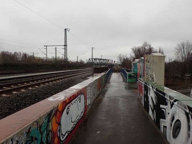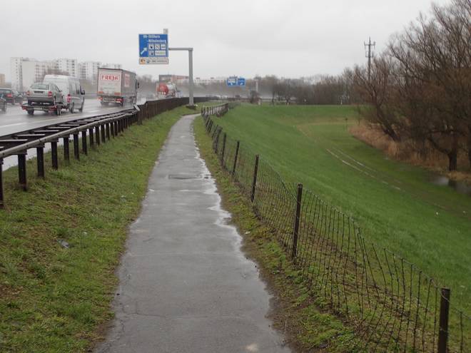 Mittlerer Landweg 15.54 Uhr / Km 50,7 In der Ferne konnte ich schon die S-Bahn-Brücke der Station Mittlerer Landweg sehen. Da war das Tagesziel. |