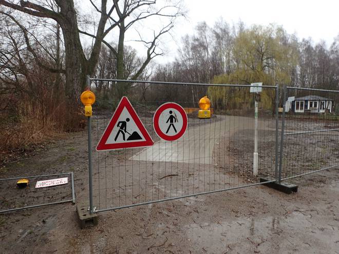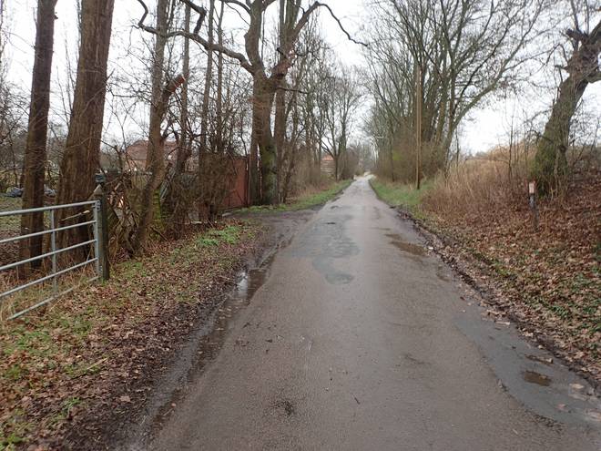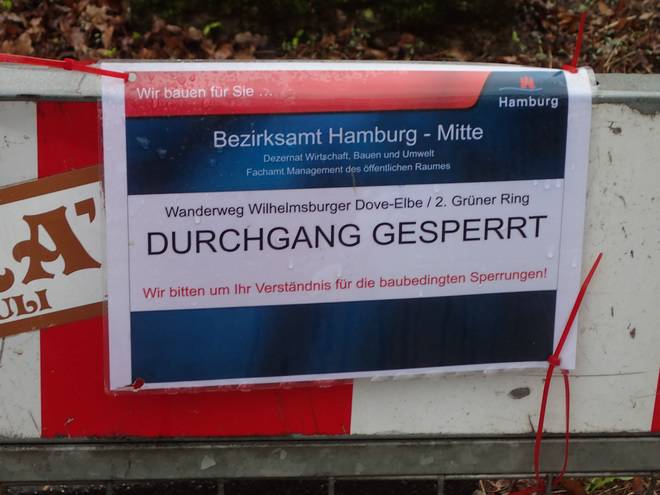 Langenhövel 13.58 Uhr / Km 35,3 Oh oh... eine Wegsperrung. Nach all dem Matsch war mir der gepflasterte Weg wohl nicht zuzumuten. |
