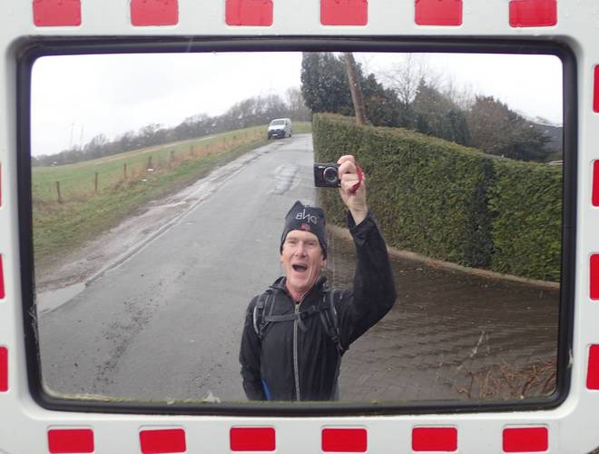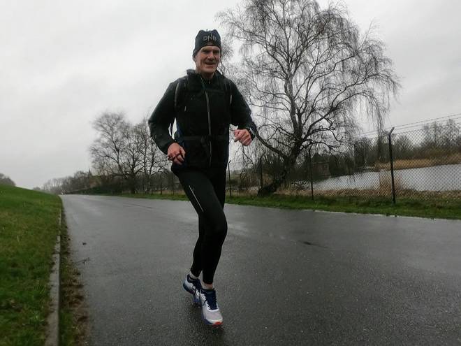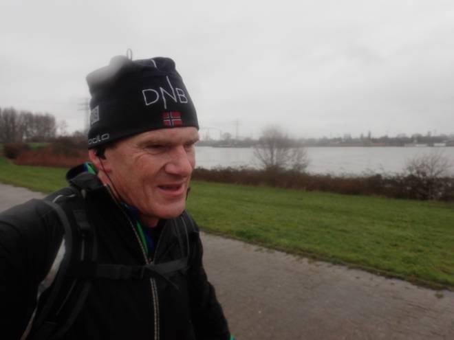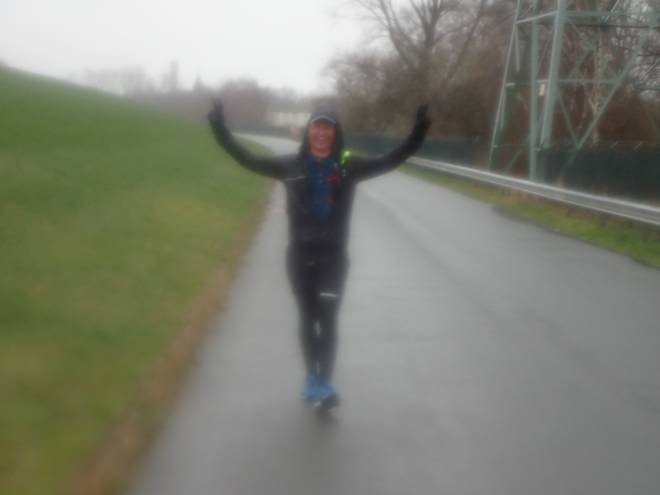 Kaltehofe Hauptdeich 15.02 Uhr / Km 41,8 Ich lief nun auf Harald auf. Außer mir die einzige Person weit und breit. Harald hatte ein riesengroßes Problem. Er wohnte nur wenig weiter direkt an der Strecke, könnte also problemlos ins Warme und Trockene gehen. Sehr verlockende Sache. Er blieb aber im Rennen. (Foto: Harald) |