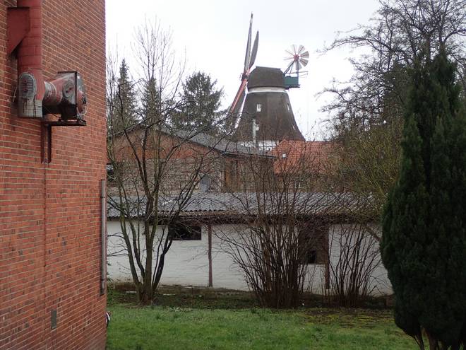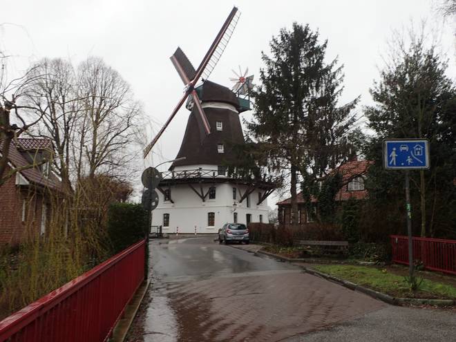 Schönenfelder Straße 13.46 Uhr / Km 33,6 Voraus die Wilhelmsburger Windmühle Johanna aus dem Jahre 1875. |