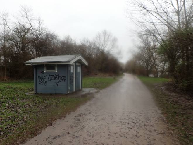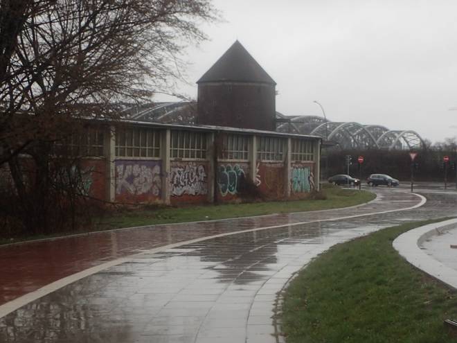 Moorfleeter Hauptdeich 15.12 Uhr / Km 43,3 Ich erreichte die Gebäude des 1990 stillgelegten Schöpf- und Vorklärwerks Billwerder Insel. |