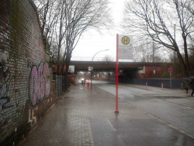 Veddeler Brückenstraße 14.28 Uhr / Km 36,7 Wieder ging es nicht weiter. Wieder mußte ich das Handy zur Hilfe nehmen. Ich hatte schon kaum noch trockene Taschentücher, um das Display zum Laufen zu bringen. Allmählich verlor ich in diesem Dauerregen die Nerven. Sich ständig zu verlaufen machte echt keinen Spaß mehr. Zudem wurde mir kalt. Aber auch hier fand ich den Weg wieder. |