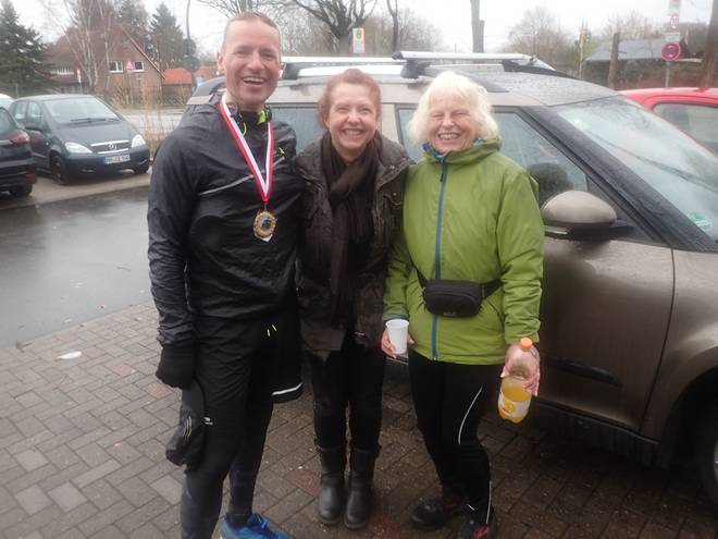 Mittlerer Landweg 16.17 Uhr Harald, seine Frau und unser (Lauf-) rettender Engel des Tages Christine. Dann machte ich mich auf den Weg nach. Am Folgetag stand Teil 2 mit noch 49 Kilometern auf dem Plan. In lediglich 17 Stunden würde ich wieder hier sein. |