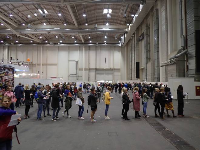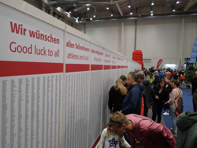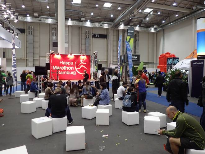 Hamburg Messe 16.41 Uhr Vor der Startunterlagen-Ausgabe gab es lange Warte-Schlangen. Als Mitglied im Blue-Line-Club (mehr als 15 erfolgreiche Teilnehmen) gab es einen Extra-Schalter mit ohne Wartezeit. |