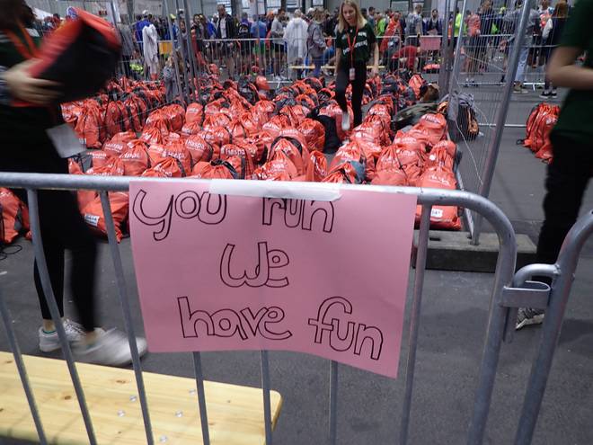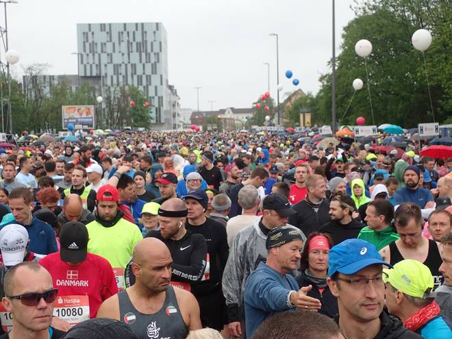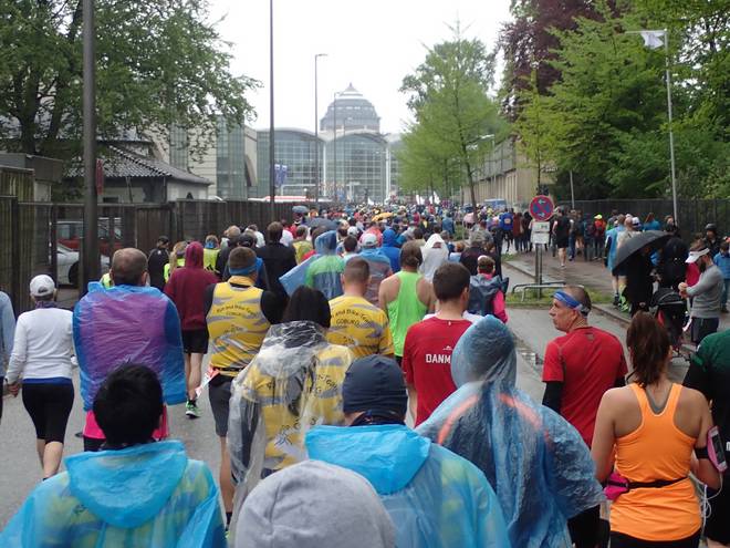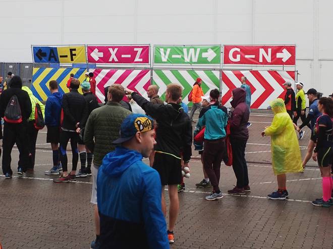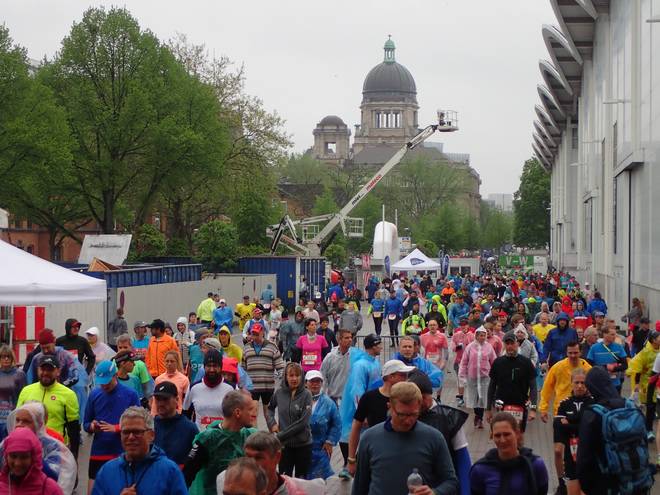 Bei den Kirchhöfen 8.08 Uhr Einmal um die Messe herum sind es 1,5 Kilometer und es gibt eine ganze Reihe von Eingängen. Der Eingang der Marathon-Läufer lag gleich neben der Start-Aufstellung vom Halbmarathon (Start 8.30 Uhr). |