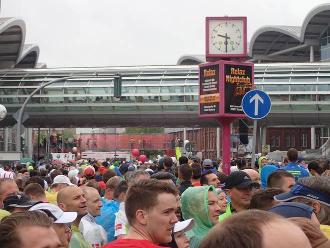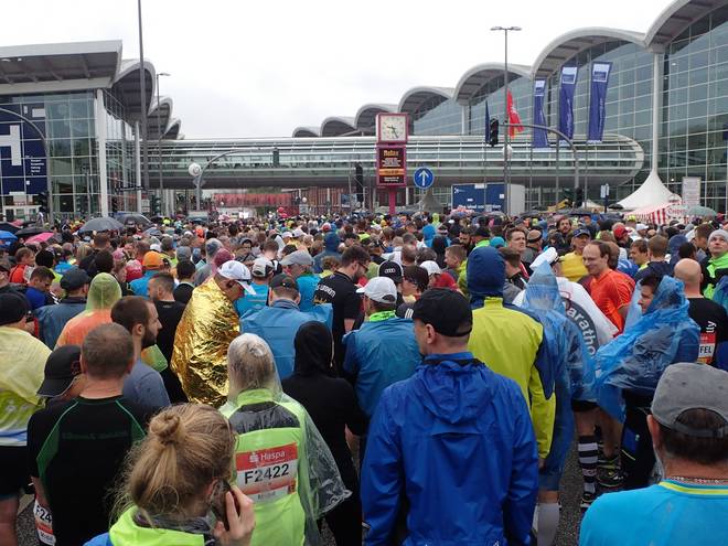 Hamburg Messe 8.48 Uhr Wer früh kommt, hat viel Zeit, um sich in Ruhe lauf-fertig zu machen. Und die Wartezeit im Dixi-Land zu ertragen. |