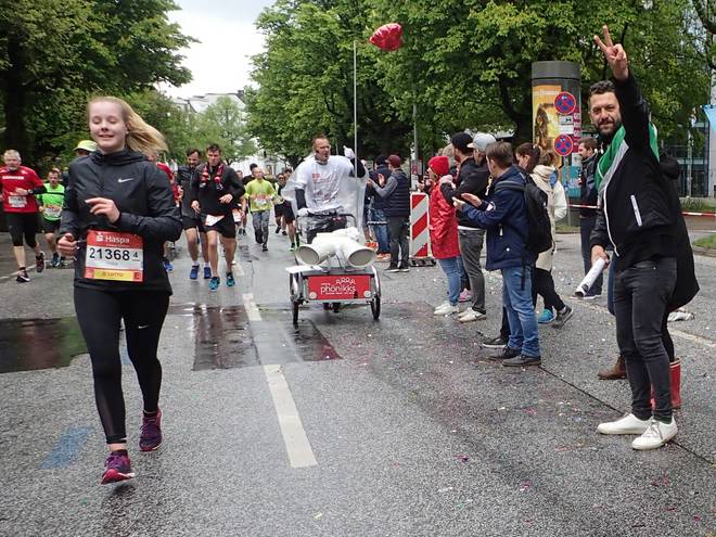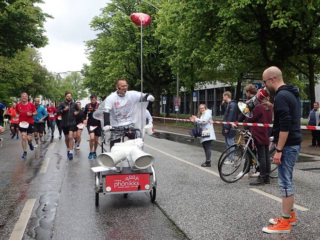 Mittelweg 13.24 Uhr / Km 40,2 Die phönikks-Läufer (teils mit Fahrrad unterwegs) sammeln für die Stiftung phönikks, eine Beratungsstelle in Hamburg für krebskranke Jugendliche, Kinder und junge Erwachsene und deren Familien. |