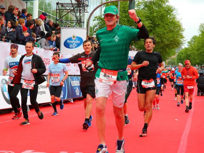 Karolinenstraße 13.34 Uhr / Km 42,18 Dann nutzte ich den roten Teppich eben zum Vor-Jubeln. (Foto: Runners World) |