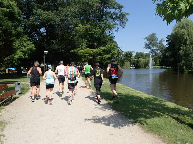 Runde 25 (30,125 Km) 15.15 Uhr 24°C. Damit konnte man so gerade leben und laufen. Mit etwas frischem Wind war es okay. |