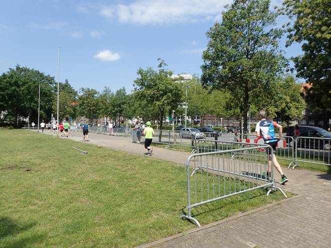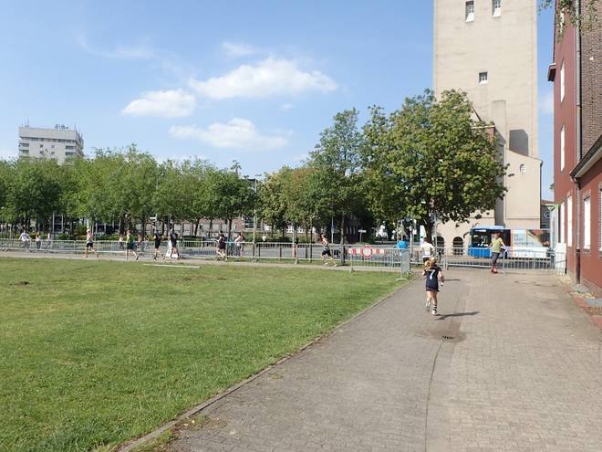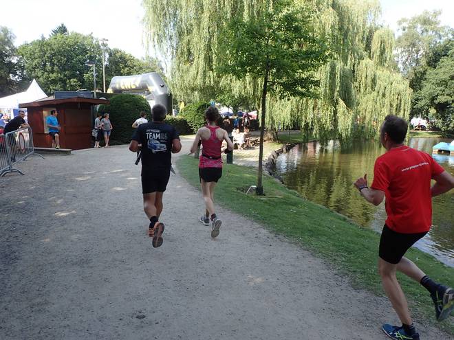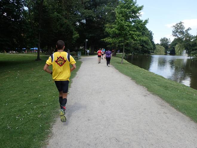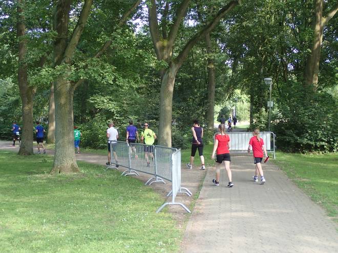 Runde 3 (3,615 Km) 12.16 Uhr Der rechts Kanal hinter dem Rundenende war den Staffeln, der linke dem Einzelläufern. Die Staffeln waren natürlich viel schneller unterwegs. Aber immerhin wurde ich nicht wieder schon in der ersten Runde überrundet. |